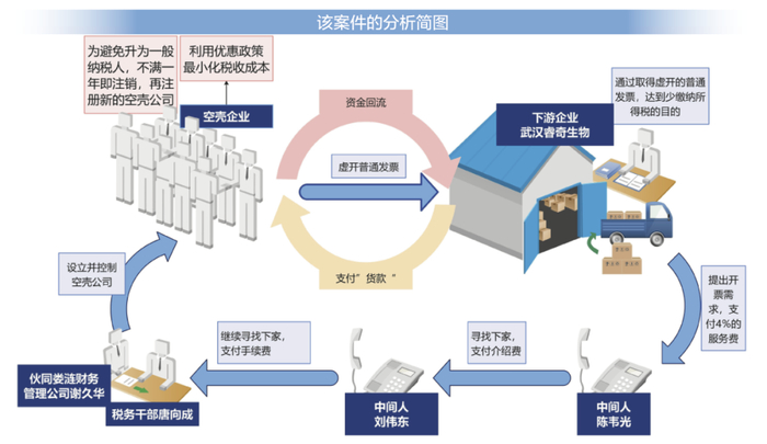 进一步侦查发现,有29家此类公司开具的发票,都流向了武汉睿奇生物工程有限公司。结合已查实的资金流水和物流单据问题,专案组约谈了武汉睿奇生物工程有限公司实际控制人刘明。刘明坦白:是他找到中间人陈韦光,以开票金额4%的“服务费”向其购买增值税普通发票,目的是通过非法取得扣除凭证增加公司成本逃避缴纳企业所得税。
