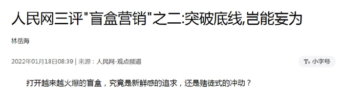 更早些时候,央媒人民网更是锐评“盲盒营销”: