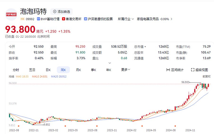 时间再拉长一点,和2022年底的低点相比,泡泡玛特的股价足足涨了8倍多!