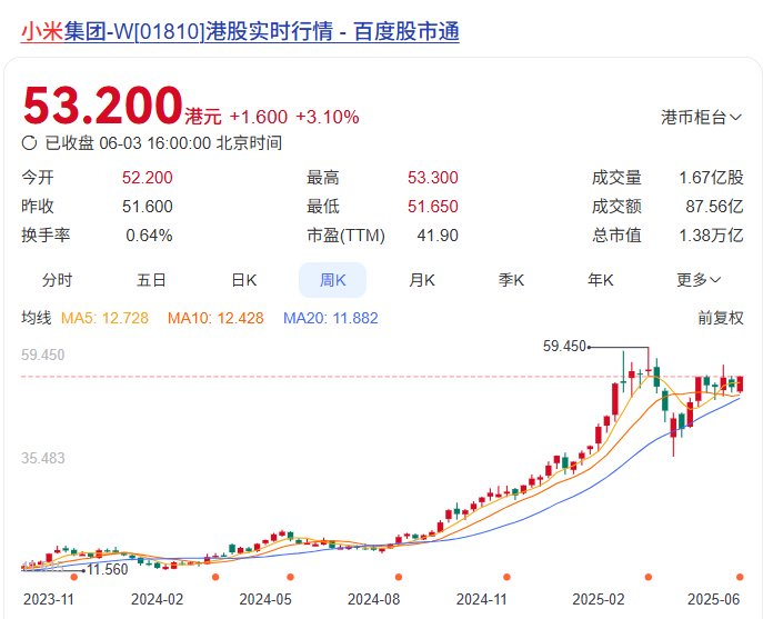 暴涨的股价更是说明了资本的认可。2024年3月开始,一年不到的时间里,小米的股价从15块涨到41块,涨幅达177%。总市值也飙升到1万亿,放到全球汽车企业的市值排名中,小米已经稳居全球前三,超过了比亚迪,仅次于特斯拉、丰田。