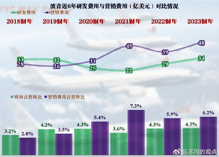 从2020-2023年,波音公司的营销费用占比就超过了研发费用,一直持续了4年。而波音公司的研发占营收比,常年在3%-5%左右,如此低的研发投入,很难想象这是一家造大飞机的“科技公司”。