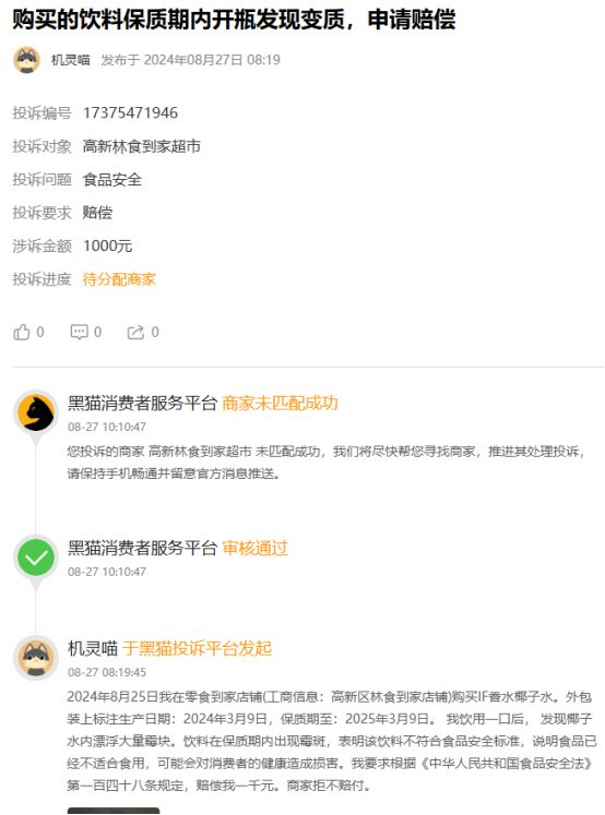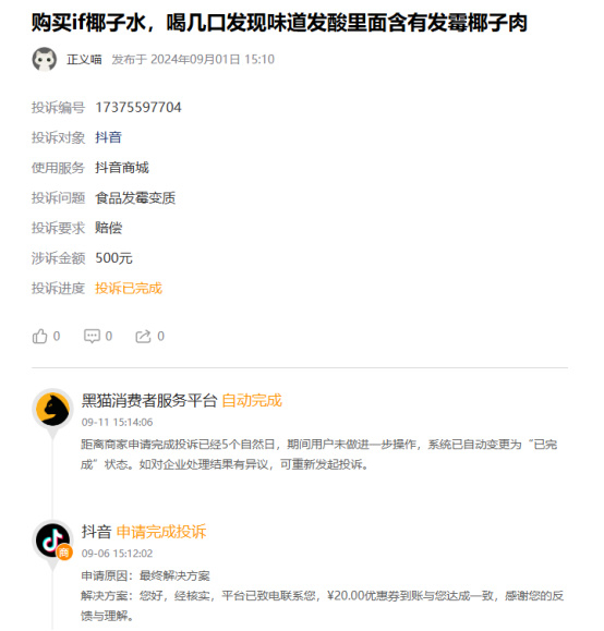 2024年8月,用户在抖音平台购买的IF椰子水被曝椰肉发霉,客服仅同意退款,拒绝按《食品安全法》赔偿。