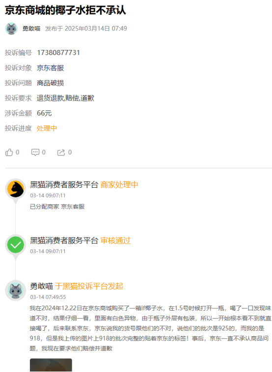 2025年3月,京东用户投诉产品含白色异物,品牌以 “批次不符” 推诿,引发消费者集体诉讼