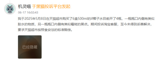 更让人担忧的是,部分投诉显示,IF椰子水在保质期内出现霉斑,代工厂是否有建立有效的微生物检测体系呢?