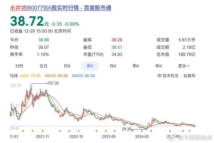 这股寒气同样体现在资本市场。截至2025年12月29日收盘,水井坊的股价为38.72元/股,相比历史高点已经跌去75%。
