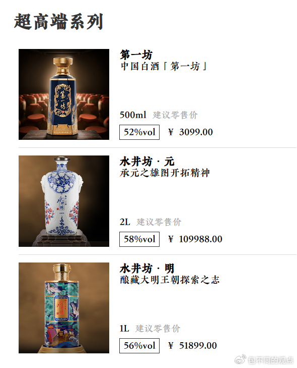 从官网公布的价格看,"第一坊"52度500ml产品标价3099元,2L的水井坊·元,建议零售价更是高达109988元。