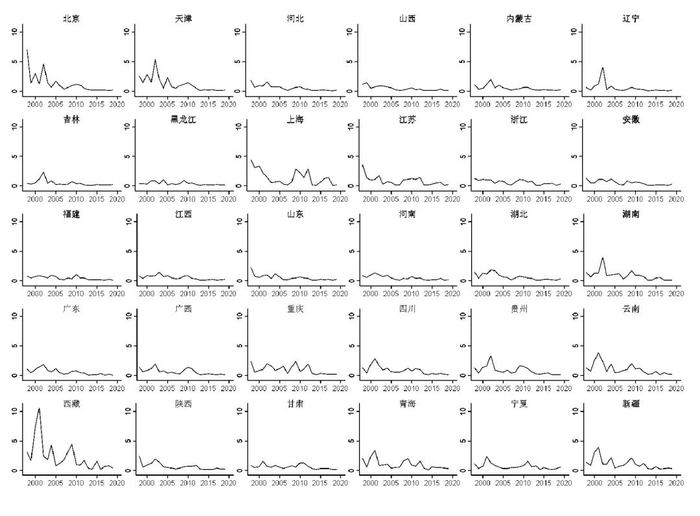 注:使用价格法测算中国省级地区商品市场分割程度,数据来自历年《中国统计年鉴》各省份的环比价格指数数据。出于统计口径一致性和数据连续性的考虑,一共选取了10类商品进行研究,分别为:粮食类、食品类、纺织品类、化妆品类、书报杂志类、中西药品类、家用电器及音像器材类、服装鞋帽类、建筑建材类、饮料烟酒类。