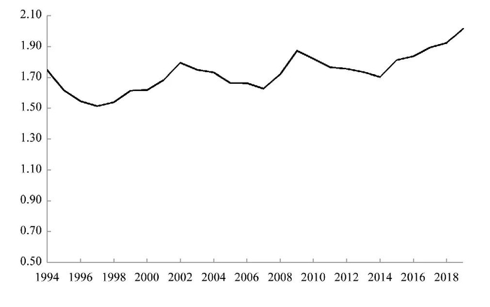 中国的分权式改革,因中央与地方在事权、财权、调控权等方面的动态匹配不够完善,使地方政府的财政收支格局出现严重窘境,这是后来“土地财政”现象和地方政府企业化运作现象出现并持续的重要成因。如图5所示,以地方财政收支比(地方财政支出/地方财政收入)看,这一指标相对较高,说明地方政府财政拮据,分税制改革并不彻底,支出端的改革滞后于收入端改革。在此情形下,为了保护税基和增加本级财政收入,地方政府利用行政权力来干预甚至直接控制当地的经济活动,倾向于多办“自己的企业”,多搞那些投资少、见效快、预期价高利大产品的项目,搞低水平重复建设,“以邻为壑”现象愈演愈烈,成为地方市场分割的催化剂。