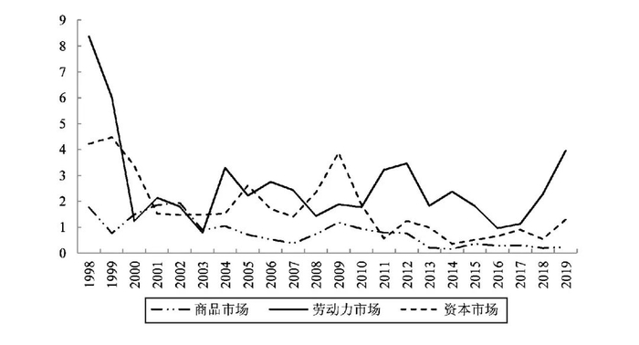 图2 1998—2019年中国商品、劳动力、资本市场相对价格方差均值走势