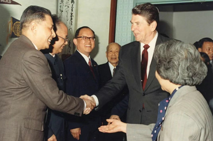▲1984年4月30日,美国总统里根访问我校时会见苏步青、谢希德、谭其骧、华中一、蒋学模等教授,图为经济学系蒋学模教授(左一)与里根总统握手。