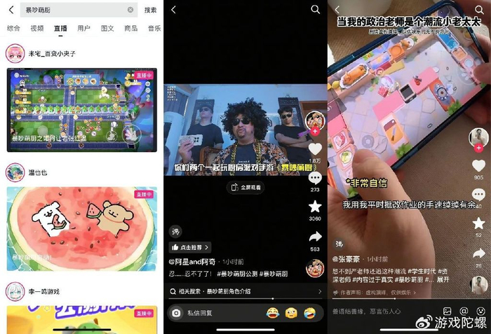 公测当天,在各大短视频平台上,涌现出大量玩家自发上传游戏相关内容,为游戏上线宣传造势。一些拥有千万级别粉丝的头部短视频博主,自发创作与《暴吵萌厨》相关的游戏视频或进行直播,将游戏热度辐射到了更广泛的人群。
