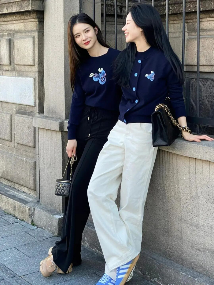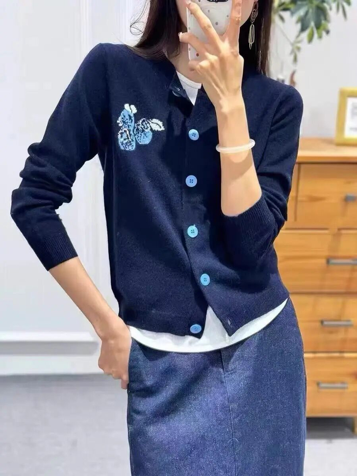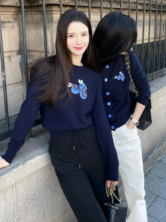 胸前那几颗俏皮的蓝莓,像跳跃在衣衫上的音符,给深邃的藏蓝增添了一抹灵动。