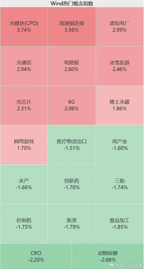 板块方面,上午通信、电子、传媒、计算机等板块走高,CPO、高速铜连接、虚拟电厂、稀土永磁等概念股持续火热;大消费板块有所回调,创新药、CRO、医美等概念股走低。