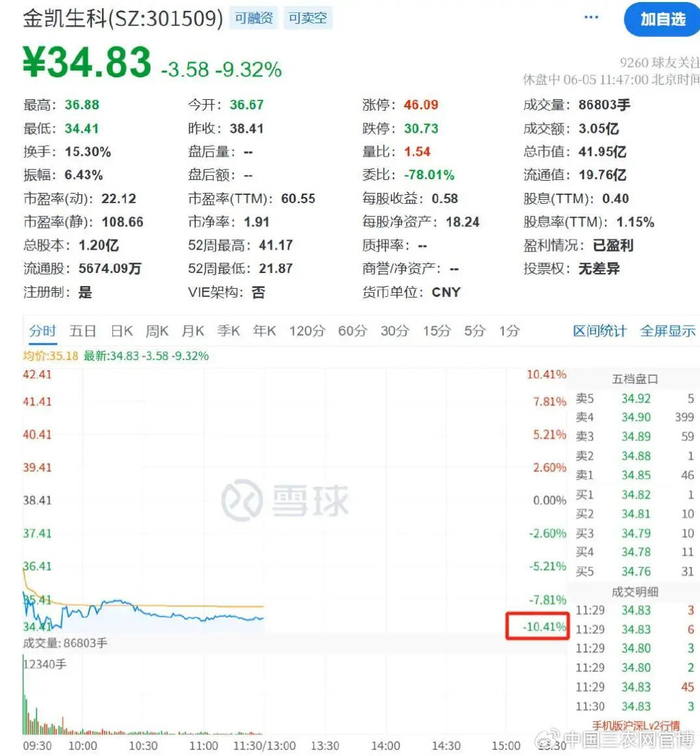 个股方面,金凯生科盘中跌超10%,截至午间收盘跌9.32%。