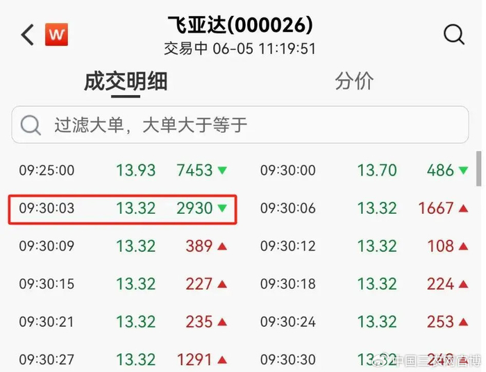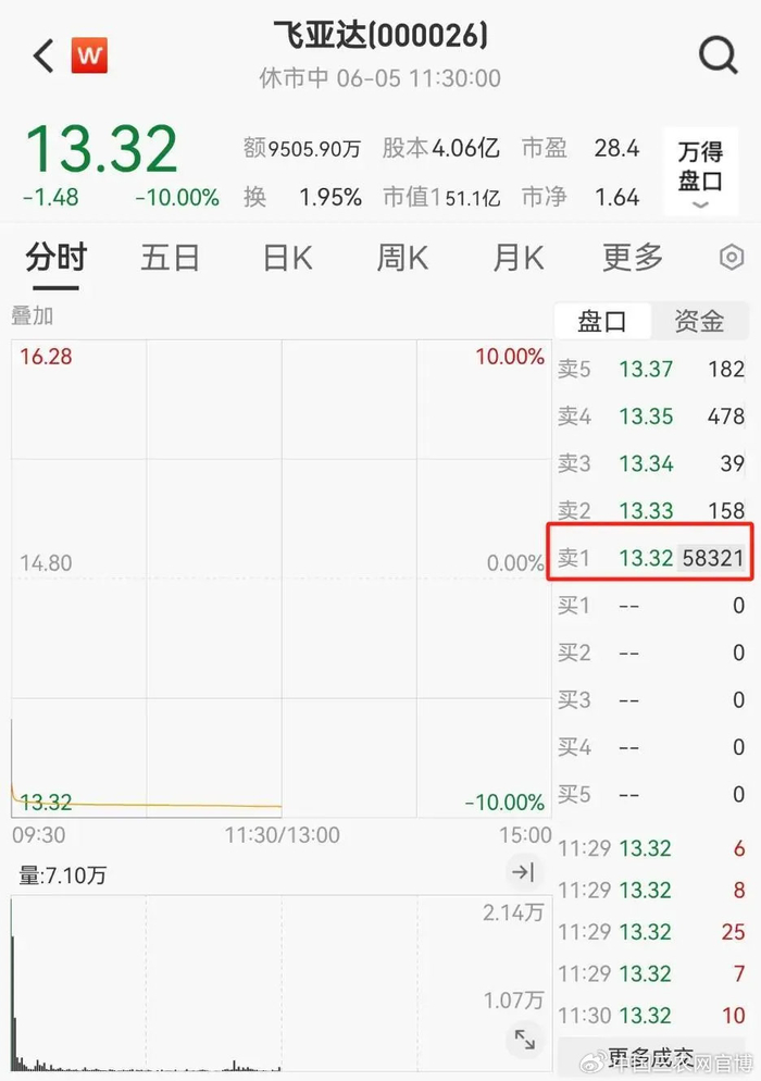6月5日早间,飞亚达以13.93元/股的价格低开。开盘后3秒钟,飞亚达即跳水跌停。截至午间收盘,飞亚达仍保持跌停状态,股价报13.32元/股,卖一超5.8万手。
