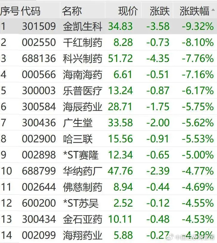 医药板块集体回调