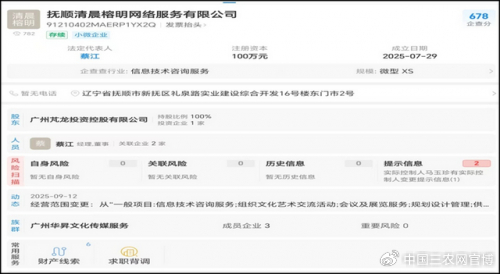 根据显示,“清晨榕明”APP的运营主体为抚顺清晨榕明网络科技服务有限公司,该公司成立于2025年7月29日,注册资本100万人民币,法定代表人蔡江,由广州芃龙投资控股有限公司100%持股。