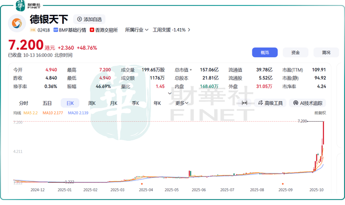10月13日,德银天下(02418.HK)再度大幅拉升,截至收盘,涨幅达48.76%,报7.2港元/股,创上市以来新高,最新总市值也随之攀升至157.06亿港元。