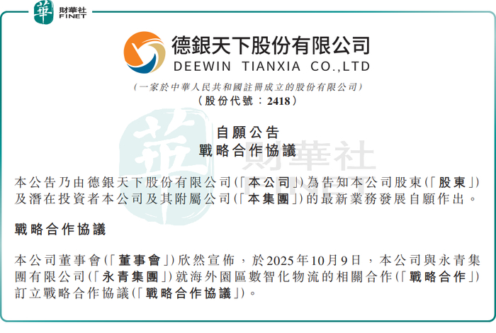 从消息面看,10月9日,德银天下公告称,与永青集团就海外园区数智化物流的相关合作订立战略合作协议。