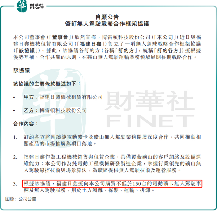 此外,今年9月,博雷顿还获得了新疆鸣阳矿业建设集团有限公司的采购意向,后者计划在2028年9月22日前向博雷顿采购不低于1000台电动矿卡无人驾驶车辆及无人驾驶服务。