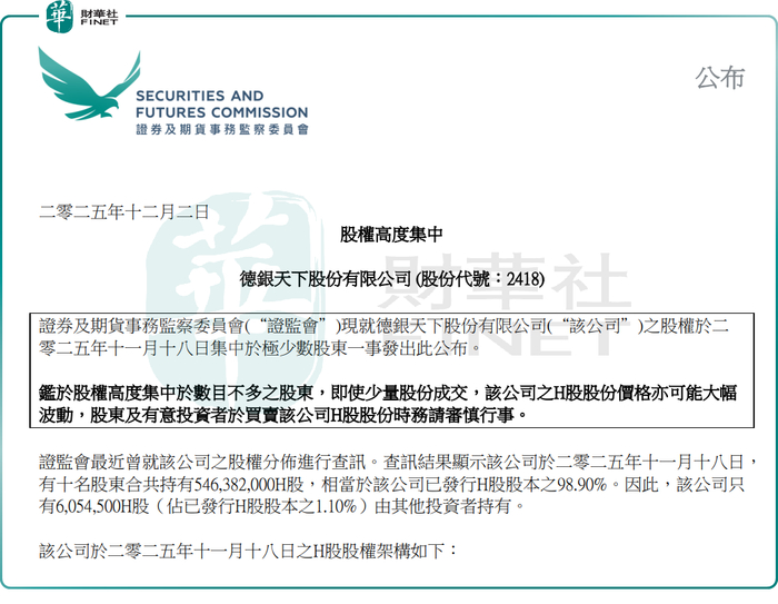 消息面,12月2日,香港证监会一纸公告揭开了德银天下的“股权高度集中”的隐忧,给投资者敲响了一记警钟。