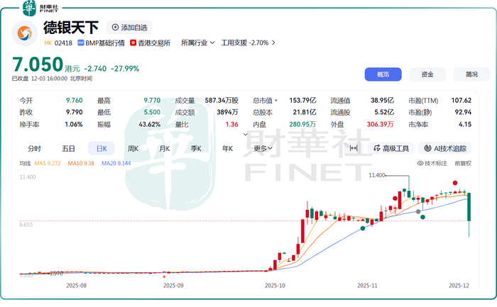 回溯德银天下的股价走势,该公司曾走出一波凌厉的上涨行情,从9月29日2.3港元的阶段低位一路攀升,到11月18日涨至9.29港元,短短1个多月的时间里,累计涨幅高达304%;于2025年12月1日,该股收市价为9.88港元,较2025年9月29日之收市价2.30港元高出330%