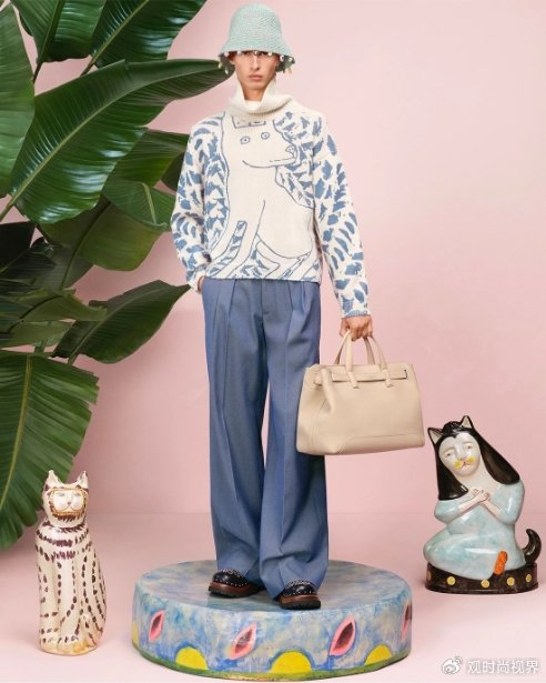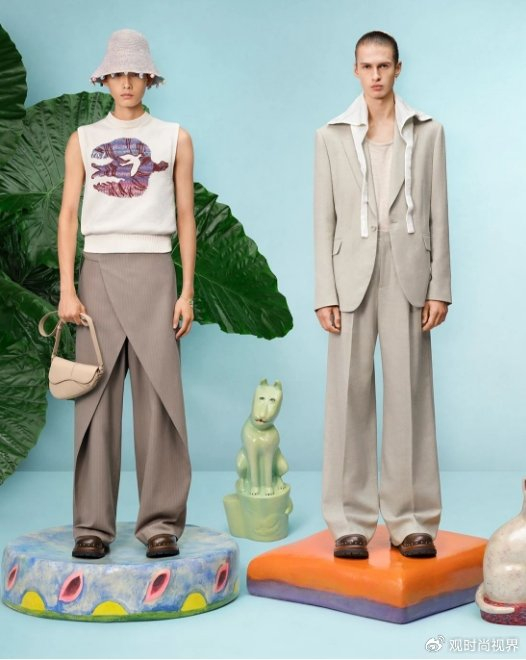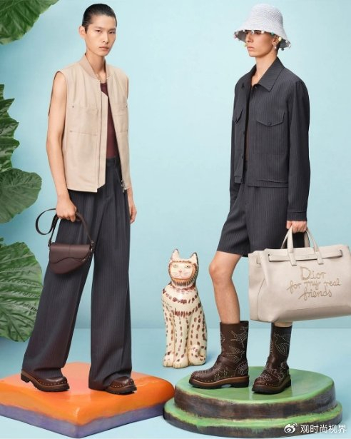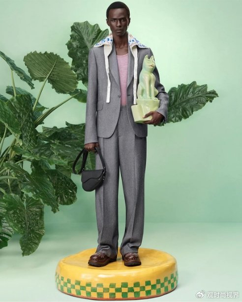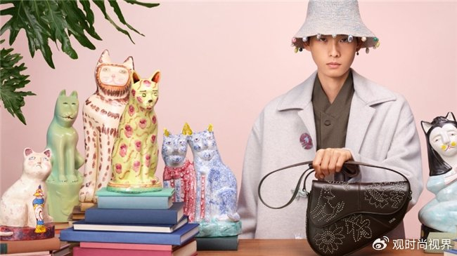 系列大片采用绿意盎然的淡雅布景与色彩缤纷的台座,