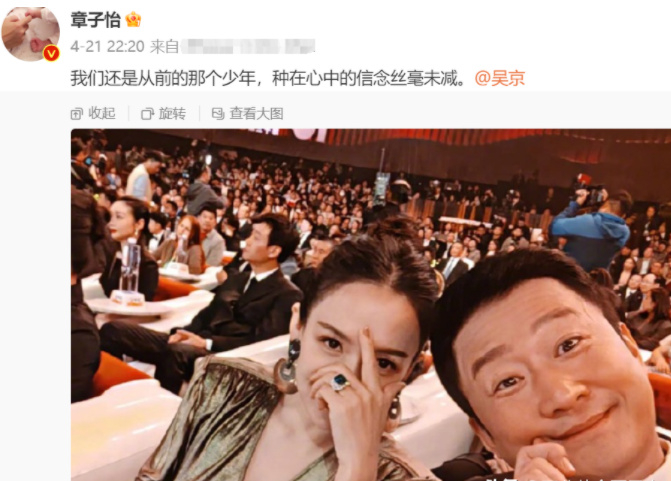 从表面来看,章子怡在和陈凯歌、张颂文在一起的时候确实不咋开心,转头找到去年合作了《我和我的家乡》的吴京立马就激动发文了。