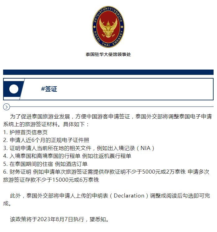 8月5日,泰国驻华大使馆宣布调整旅游签证申请材料,8月7日起执行。
