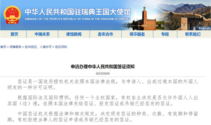 近日,中国驻瑞典大使馆发布了新版《申请办理中华人民共和国签证须知》。