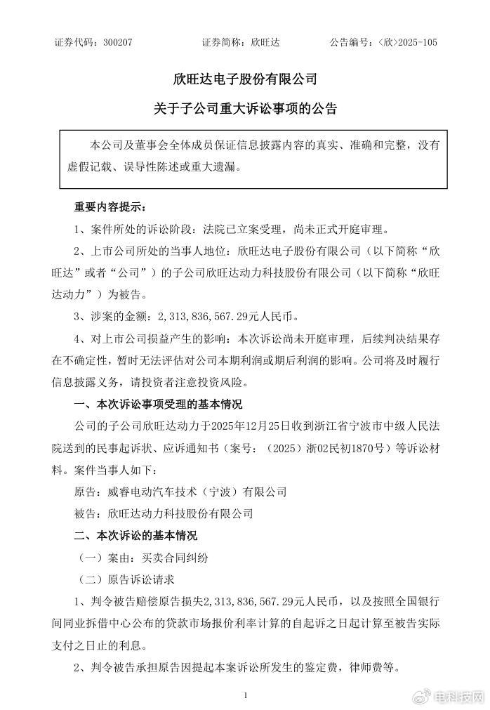 威睿在诉状中明确,索赔依据是 2021 年 6 月至 2023 年 12 月期间,欣旺达动力交付的动力电池电芯存在质量问题,导致其产生巨额损失。除 23.14 亿元本金外,威睿还要求欣旺达动力支付自起诉日起算、按 LPR 计算的利息,并承担鉴定费、律师费等全部诉讼成本。