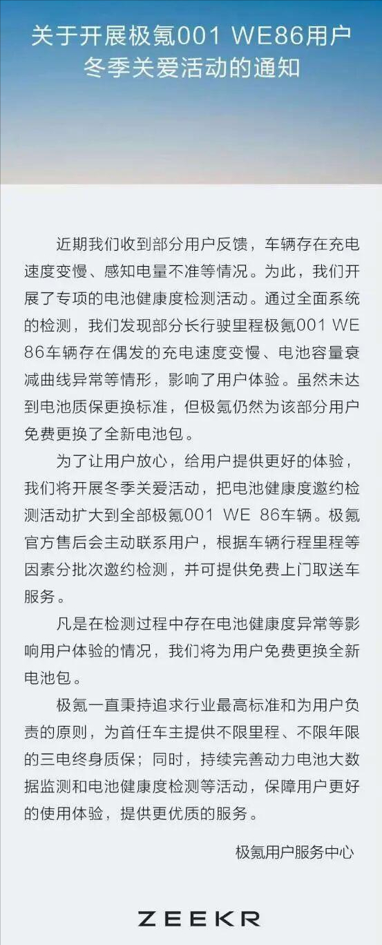 但合作背后,质量隐患已现 ——2024 年 12 月,极氪曾公告称,部分极氪 001 WE86 车型(搭载欣旺达电池)存在充电速度变慢、电池容量衰减异常等问题,即便未达质保更换标准,仍为用户免费更换电池包,并启动全量车主检测。