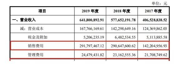2017-2019年,维康药业的销售费用分别为1.42亿元、2.91亿元和2.92亿元,同比分别增长153.89%、104.39%、0.4%。