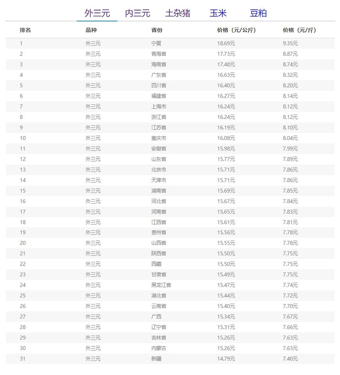 2024年12月7日-中国养猪网生猪()均价排行榜外三元
