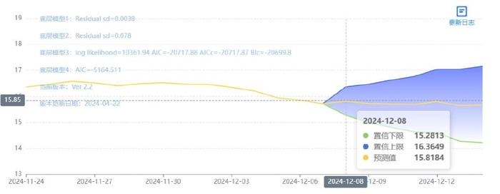 玄田算法是由项目课题组团队原创的非经典逻辑数值聚合理论和不确定性预测方法,构建了基于一致模算子的生预测模型。该模型采用的聚合函数及一致模相关理论与方法已获得多项国家自然科学基金和省级自然科学资金资助,并获得多项省级自然科学奖奖项。12月8日预测猪价为15.8184,置信区间在15.2813--16.3649之间。12月9日预测猪价为15.7295;12月10日预测猪价为15.7101。猪价格