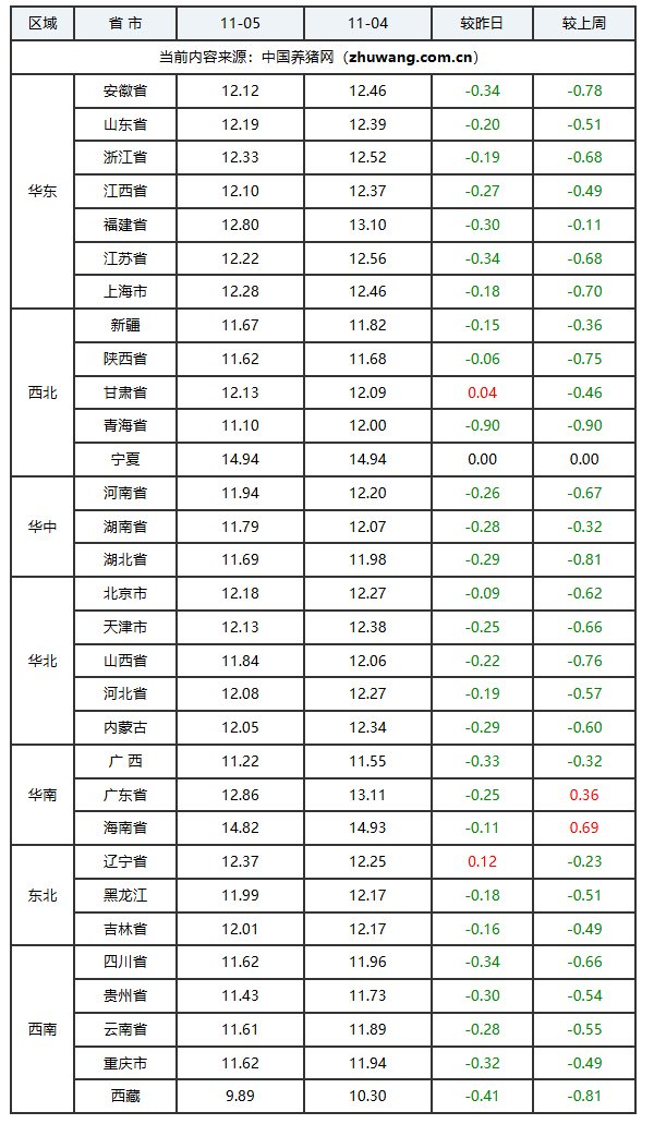 今日,全国生猪市场整体呈现下行态势,外三元生猪均价12.01元/公斤,较前一日下滑0.22元/公斤,猪价不断承压走低。从区域来看,北方地区行情普遍偏弱,社会养殖户报价变动不大,整体以稳中偏弱为主,而集团企业的出栏价格则出现一定下调。近期二次育肥补栏积极性有所减弱,养殖端出猪意愿一般,同时屠宰企业因亏损压力维持低宰量,市场供需略显失衡,预计短期猪价仍将延续偏弱格局。南方多地猪价也同步走低,部分区域跌幅相对明显;此前价格虽有回升,但白条猪肉消费跟进不足,终端走货不畅,加上二次育肥热情降温,市场缺乏有力支撑,猪价或继续面临下行压力。整体来看,当前猪市供需双方均显疲软,缺乏利好因素提振,价格短期难改弱势震荡局面。