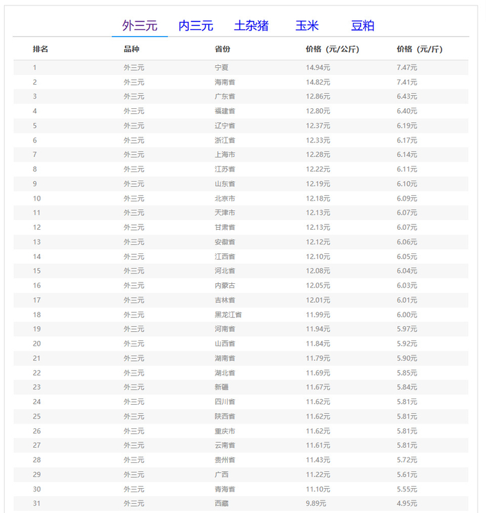 外三元排行前三:宁夏回族自治区14.94元/公斤、海南省14.82元/公斤、广东省12.86元/公斤;