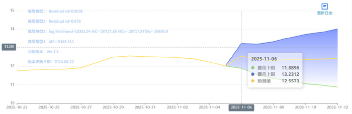 玄田算法是由项目课题组团队原创的非经典逻辑数值聚合理论和不确定性预测方法,构建了基于一致模算子的生猪价格预测模型。该模型采用的聚合函数及一致模相关理论与方法已获得多项国家自然科学基金和省级自然科学资金资助,并获得多项省级自然科学奖奖项。11月06日预测猪价为12.5573,置信区间在11.8896--13.2312之间。11月07日预测猪价为12.3613;11月08日预测猪价为12.3113。