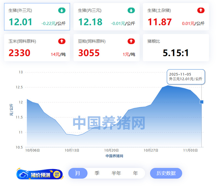 全国(生猪品种:内三元)均价为12.18元/公斤,猪价较昨日下跌0.01元/公斤,环比上涨7.79%,同比下跌29.06%;