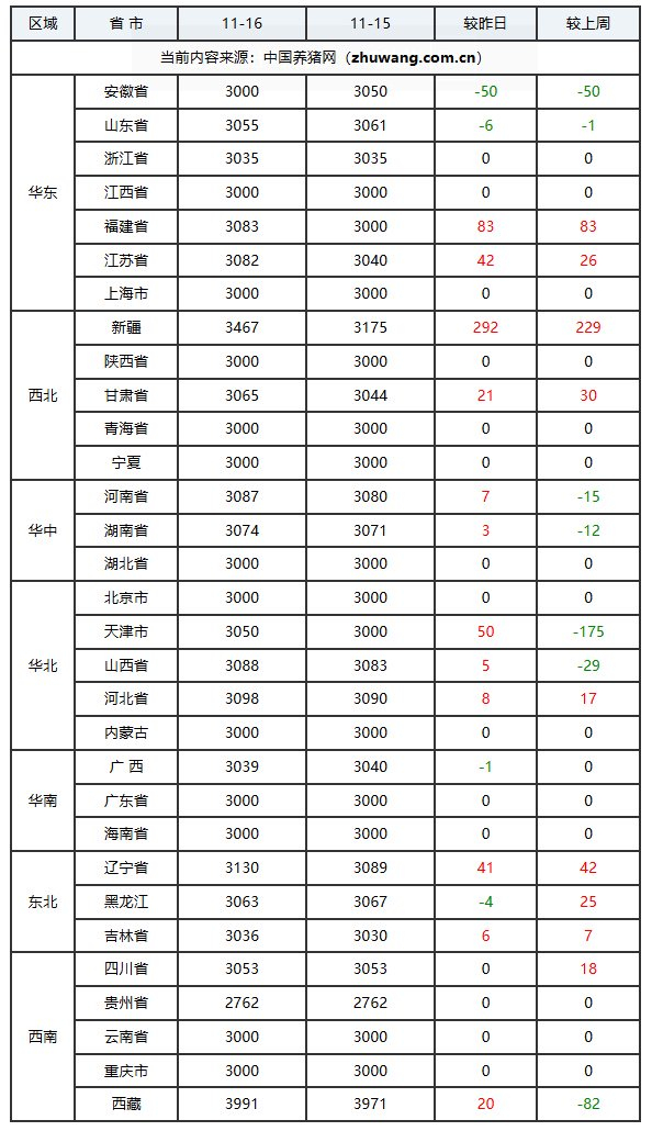 猪价下跌地区(17个):安徽省、四川省、河北省、上海市、江苏省、河南省、湖北省、北京市、天津市、山西省、西藏自治区、浙江省、江西省、福建省、陕西省、甘肃省、广东省;下跌区间:0.01-0.19元/公斤;