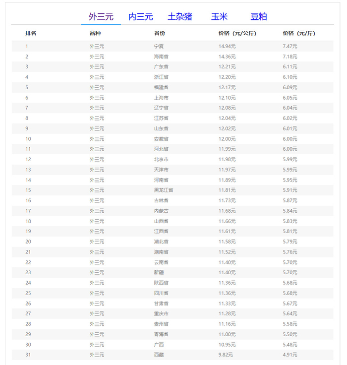 全国外三元生猪价格排行榜