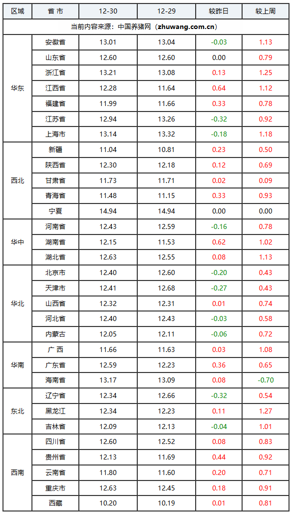 猪价下跌地区(10个):安徽省、辽宁省、吉林省、内蒙古自治区、江苏省、上海市、河南省、北京市、天津市、河北省;下跌区间:0.01-0.01元/公斤;