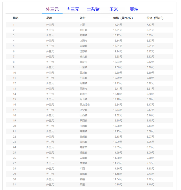全国外三元生猪价格排行榜