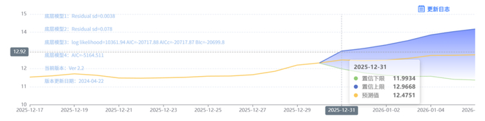 玄田算法是由项目课题组团队原创的非经典逻辑数值聚合理论和不确定性预测方法,构建了基于一致模算子的生猪价格预测模型。该模型采用的聚合函数及一致模相关理论与方法已获得多项国家自然科学基金和省级自然科学资金资助,并获得多项省级自然科学奖奖项。12月31日预测猪价为12.4751,置信区间在11.9934--12.9668之间。01月01日预测猪价为12.4355;01月02日预测猪价为12.4620。