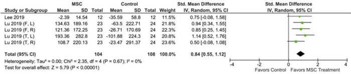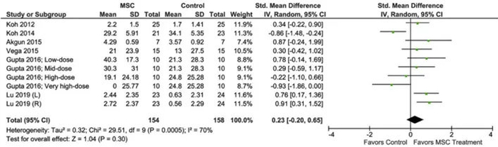 22项研究报告了功能结果评分,其中7项研究和8个数据集比较了MSC治疗组(n=161)和对照组(n=164)的功能改善情况。