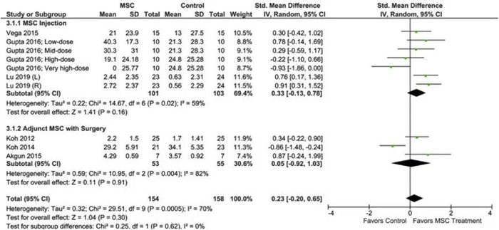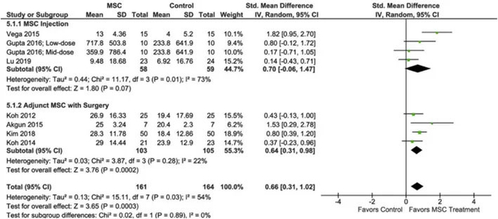 荟萃分析结果表明MSC治疗改善了患者身体机能,提高了患者的生活质量。进一步评估MSC注射给药组及MSC+手术组的身体机能改善情况,发现接受MSC+手术组改善身体机能效果更好。