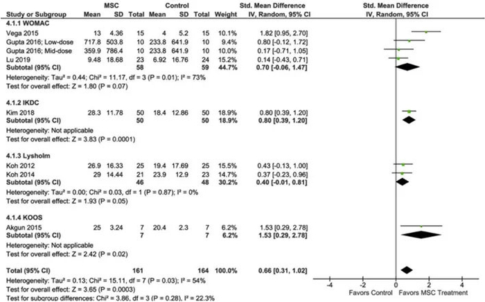 共有9项研究通过视觉模拟量表(VAS)评估了MSC治疗对膝关节疼痛的影响。进一步评估MSC组及MSC+手术组的疼痛改善情况,发现相比于MSC组,MSC+手术改善膝关节疼痛效果更显著。