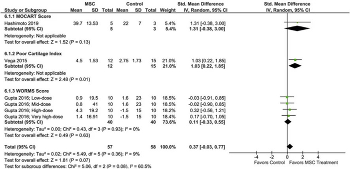 5项研究报告了MSC治疗后软骨体积的变化。荟萃分析发现相比于对照组,MSC治疗组软骨体积显著改善,不过软骨质量的变化还有待进一步探讨。