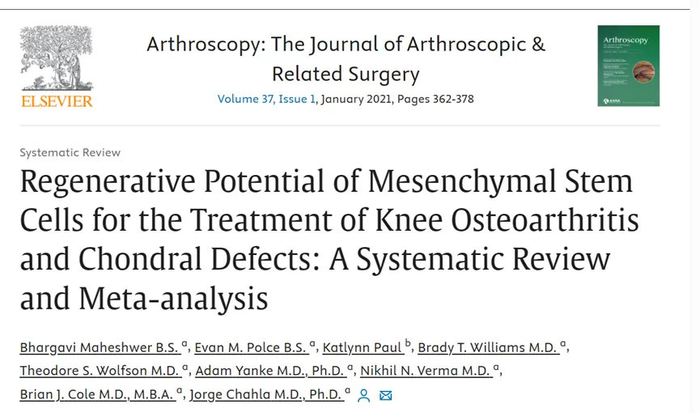 [1] Maheshwer B, Polce EM, Paul K, et al. Regenerative Potential of Mesenchymal Stem Cells for the Treatment of Knee Osteoarthritis and Chondral Defects: A Systematic Review and Meta-analysis. Arthroscopy. 2021;37(1):362-378. doi:10.1016/j.arthro.2020.05.037