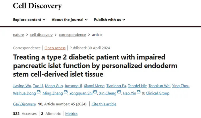 这是国际上首次利用干细胞来源的自体再生胰岛移植,成功治愈胰岛功能严重受损糖尿病的病例报道。